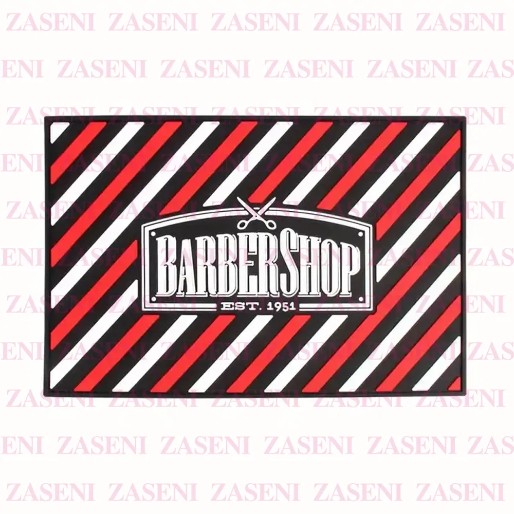 Alfombrilla de goma gruesa antideslizante con diseño de líneas rojas y blancas diseñada para cuidar herramientas de peluquería y proteger superficies de trabajo.