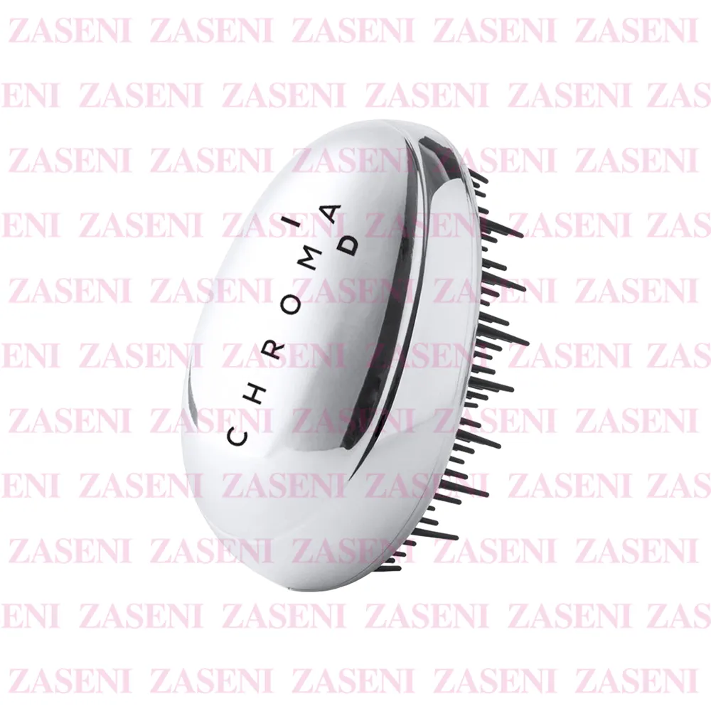 Cepillo desenredante con forma ovalada en un bonito color plata cromado diseñado para desenredar de forma suave y práctica el cabello y retocarlo siempre que se necesite.