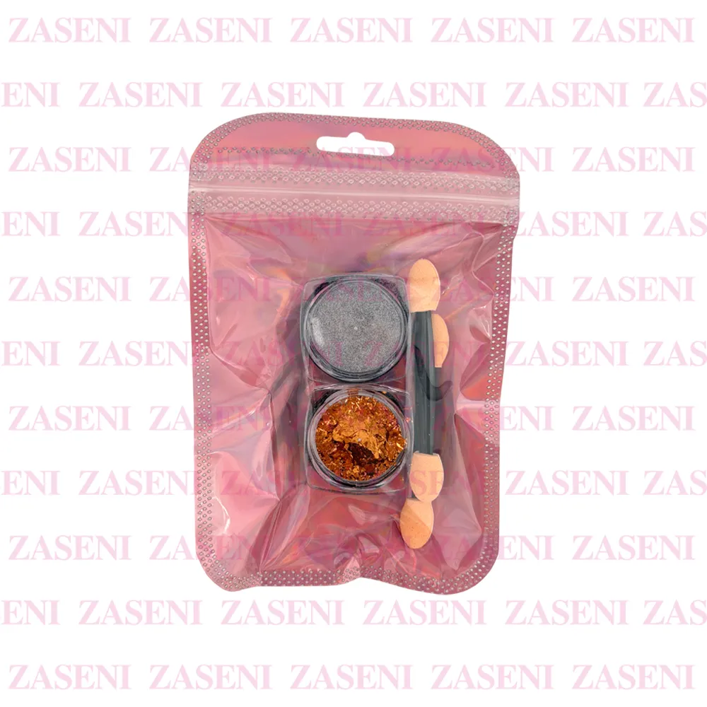 - 2 botecitos de polvo de uñas de diferentes tonos y texturas.
