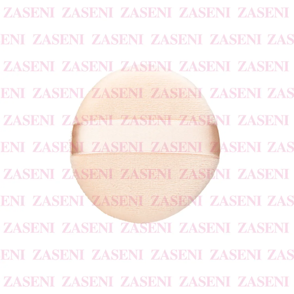 Borla de maquillaje grande fabricada en algodón y con cinta de raso diseñada para aplicar de manera suave y uniforme el maquillaje en polvo.