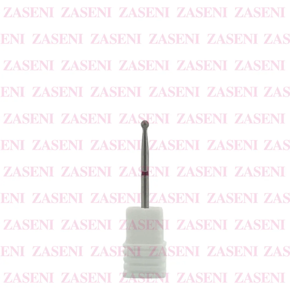 Fresa de carburo de tungsteno diamantada con forma de bola pequeña y gramaje fino diseñada para trabajar pliegues laterales y cutículas, retirando piel muerta y suavizando la cutícula tras levantarla.