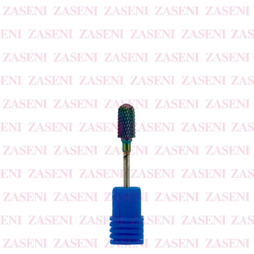 Fresa de carburo de tungsteno con recubrimiento de titanio con forma de barril redondeado largo y gramaje grueso ideal para rebajar, acortar uñas artificiales y alisar la superficie, retirando rápidamente el material artificial y no siendo apta para uña natural.