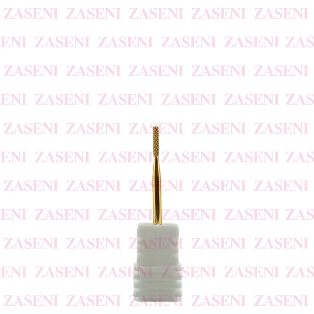 Fresa de carburo de tunsgteno con recubrimiento de titanio con forma cilíndrica estrecha y gramaje extrafino ideal para retirar producto en zonas pequeñas, conseguir precisión en laterales y cutícula y para realizar correcciones puntuales.