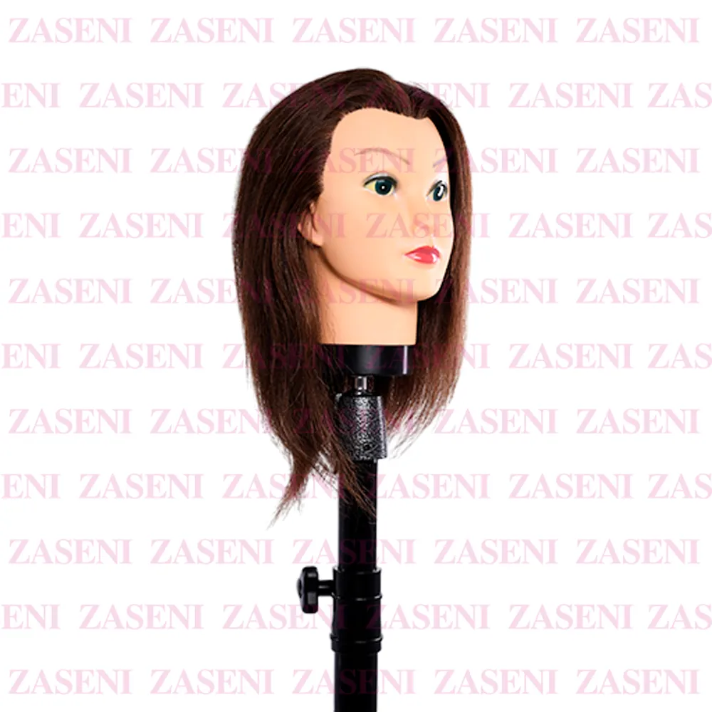 Cabeza de maniquí de cabello 100% natural de densidad normal y 30 cm de longitud con soporte incluido para realizar prácticas de peluquería.