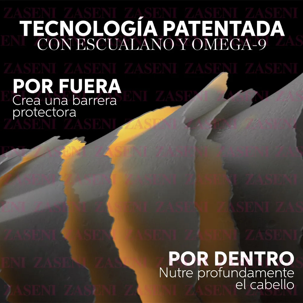 Mascarilla con tecnología patentada con escualano y omega-9 que nutre intensamente el cabello por dentro y por fuera a la vez que reduce el encrespamiento dejándolo visiblemente más suave y brillante.