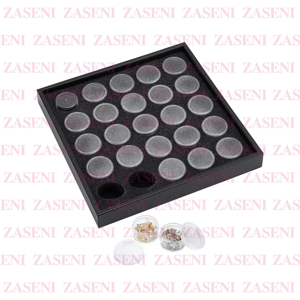 Bandeja de piedra de forma cuadrada con 25 paquetes pequeños de plástico para guardar y organizar las decoraciones de uñas manteniéndolas en perfecto estado para un uso cómodo y práctico.