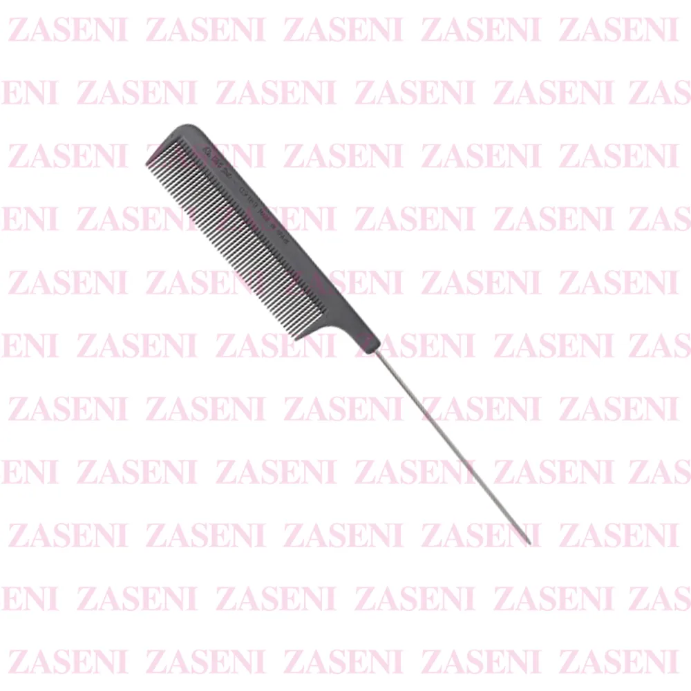 Peine profesional de carbono antiestático con púa de metal diseñado para realizar particiones precisas y trabajos técnicos de peluquería.