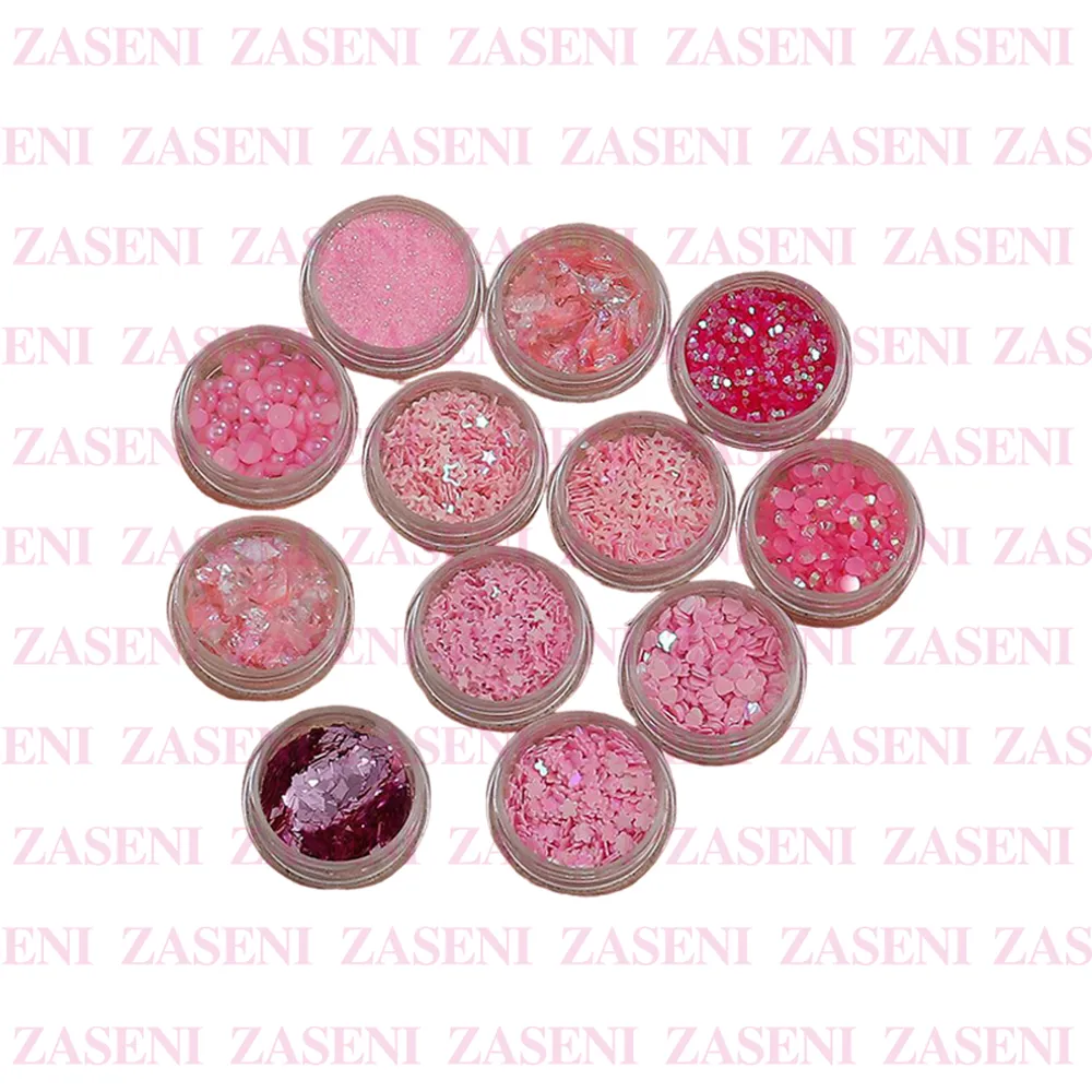 Decoración para uñas con distintos tipos de efectos y formas en diferentes tonos de rosa.