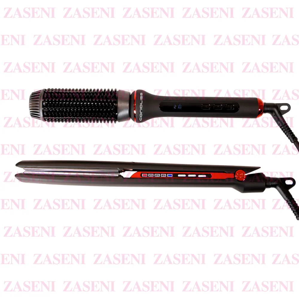 Kit de Edición Limitada de Navidad compuesto por dos herramientas profesionales de peinado, en un elegante y bonito color negro mate con detalles rojos metalizados, que consiguen los mejores y más profesionales resultados en el cabello, la plancha de pelo C3 y el cepillo eléctrico Hot Brush de Corioliss.