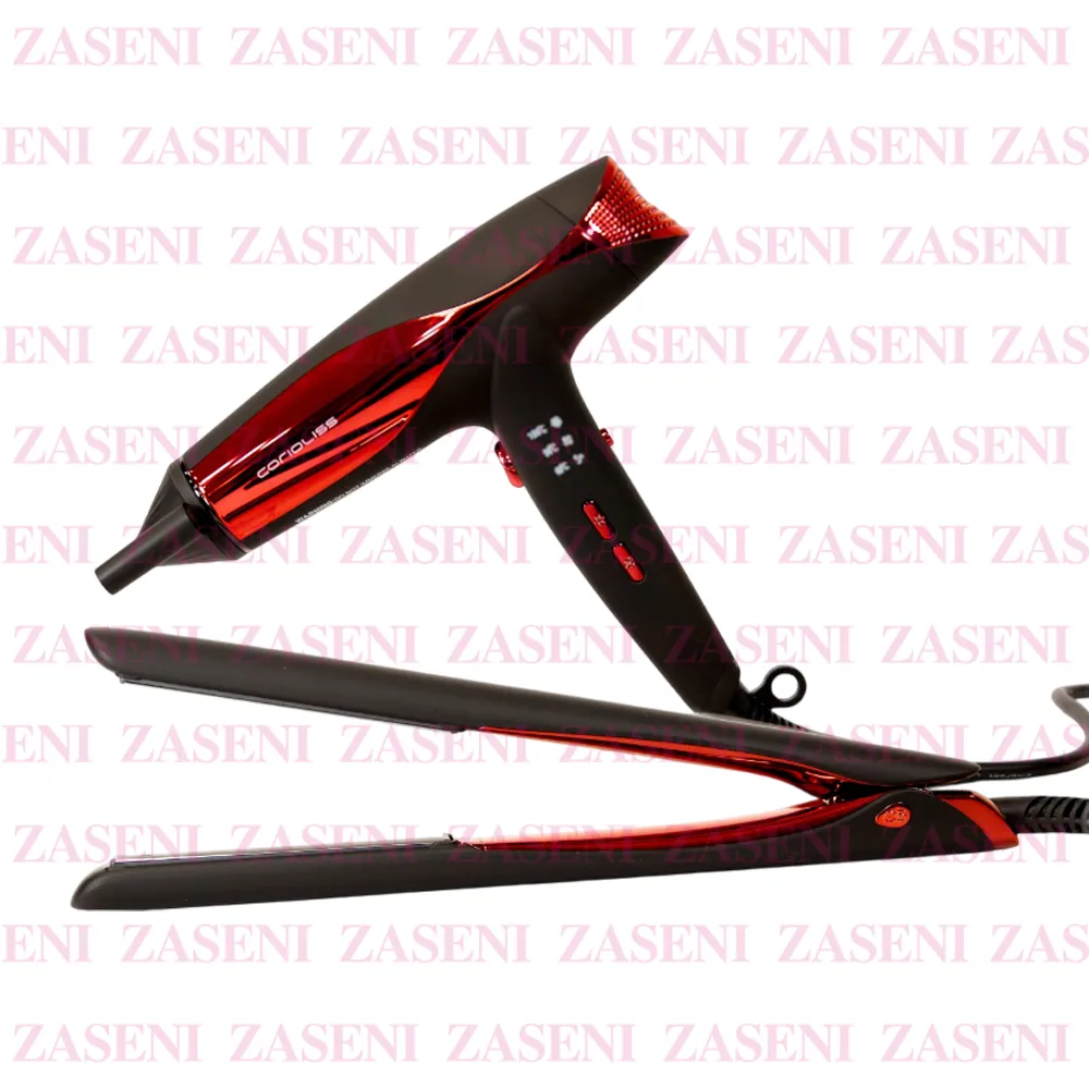 Kit de Edición Limitada de Navidad compuesto por dos potentes herramientas profesionales de peinado, en un elegante y bonito color negro mate con detalles rojos metalizados, que consiguen los mejores y más profesionales resultados en el cabello, la plancha C5 y el secador WIND de Corioliss.