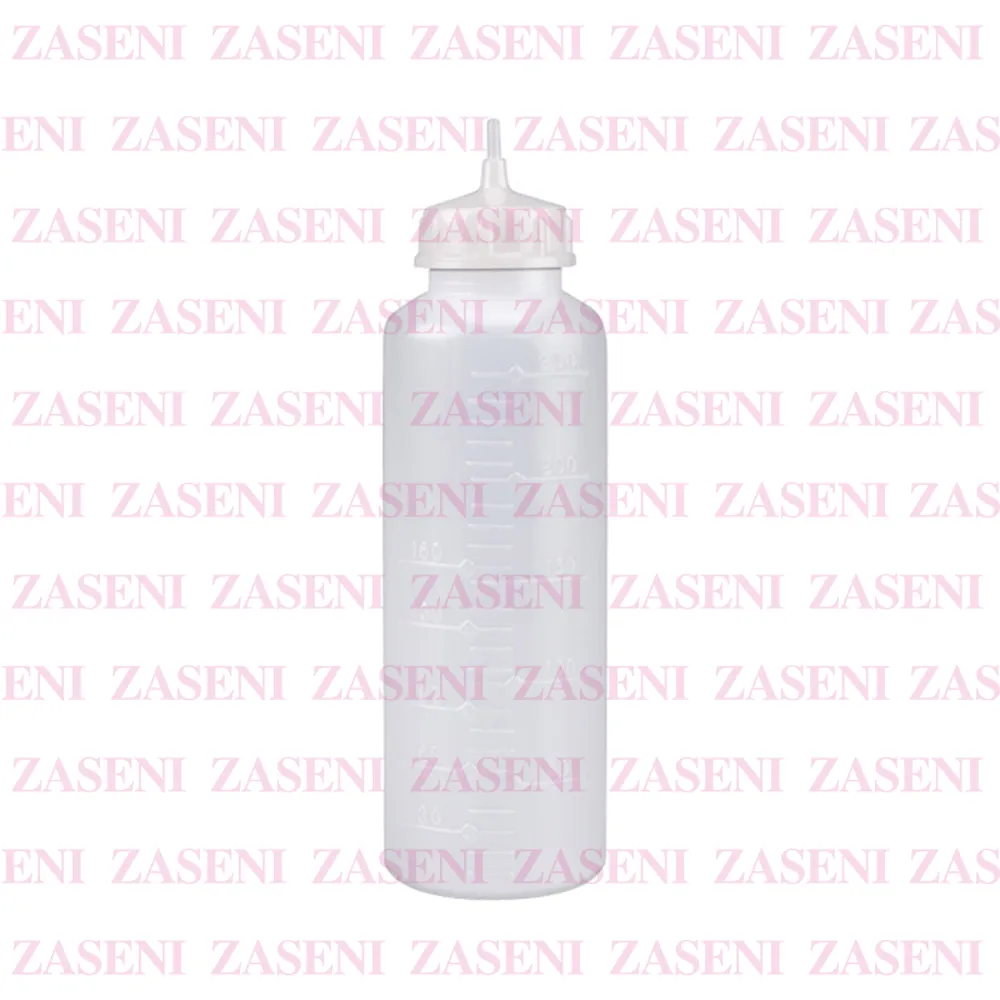 Botella medidora con dosificador transparente, resistente y fácil de limpiar con una capacidad de 250ml.