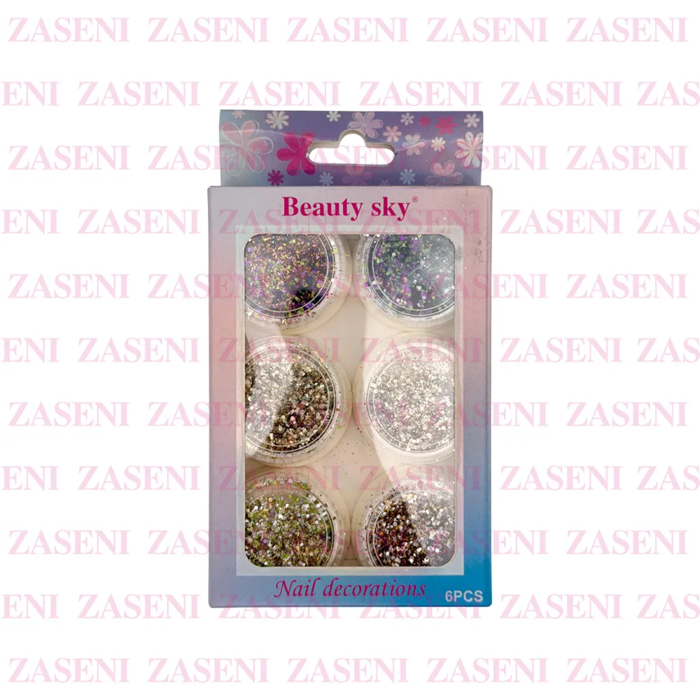 Set de decoraciones para uñas con 6 frascos de distintos estilos y colores ideales para crear diseños únicos y personalizados consiguiendo una manicura única y llamativa.