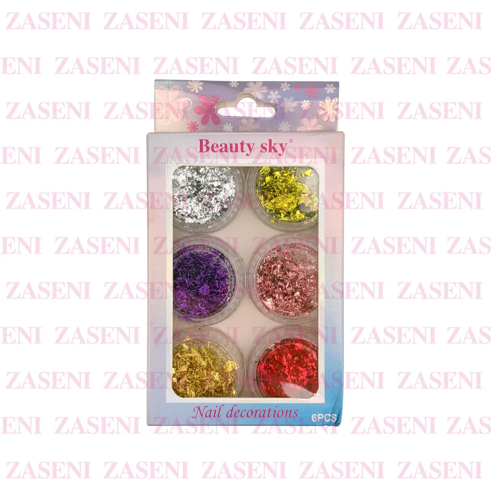 Set de decoraciones para uñas con 6 frascos de distintos estilos y colores ideales para crear diseños únicos y personalizados consiguiendo una manicura única y llamativa.
