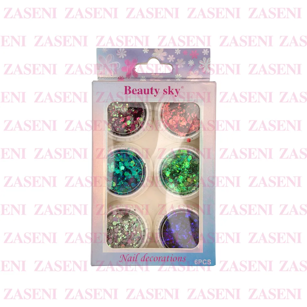 Set de decoraciones para uñas con 6 frascos de distintos estilos y colores ideales para crear diseños únicos y personalizados consiguiendo una manicura única y llamativa.