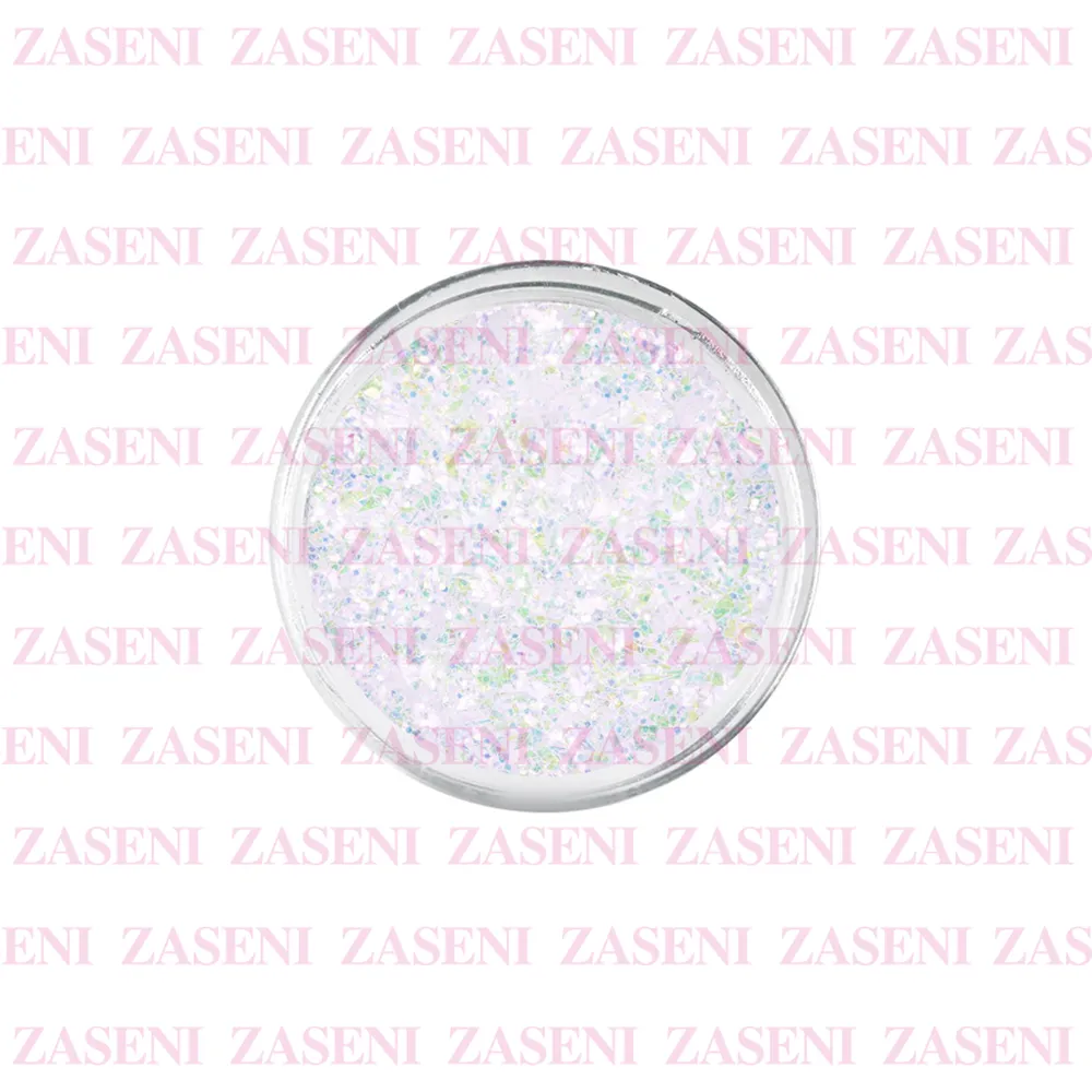 Polvo de uñas con delicadas partículas de brillo que proporciona un efecto iridiscente de diamante triturado complementado con partículas brillantes consiguiendo un acabado único.