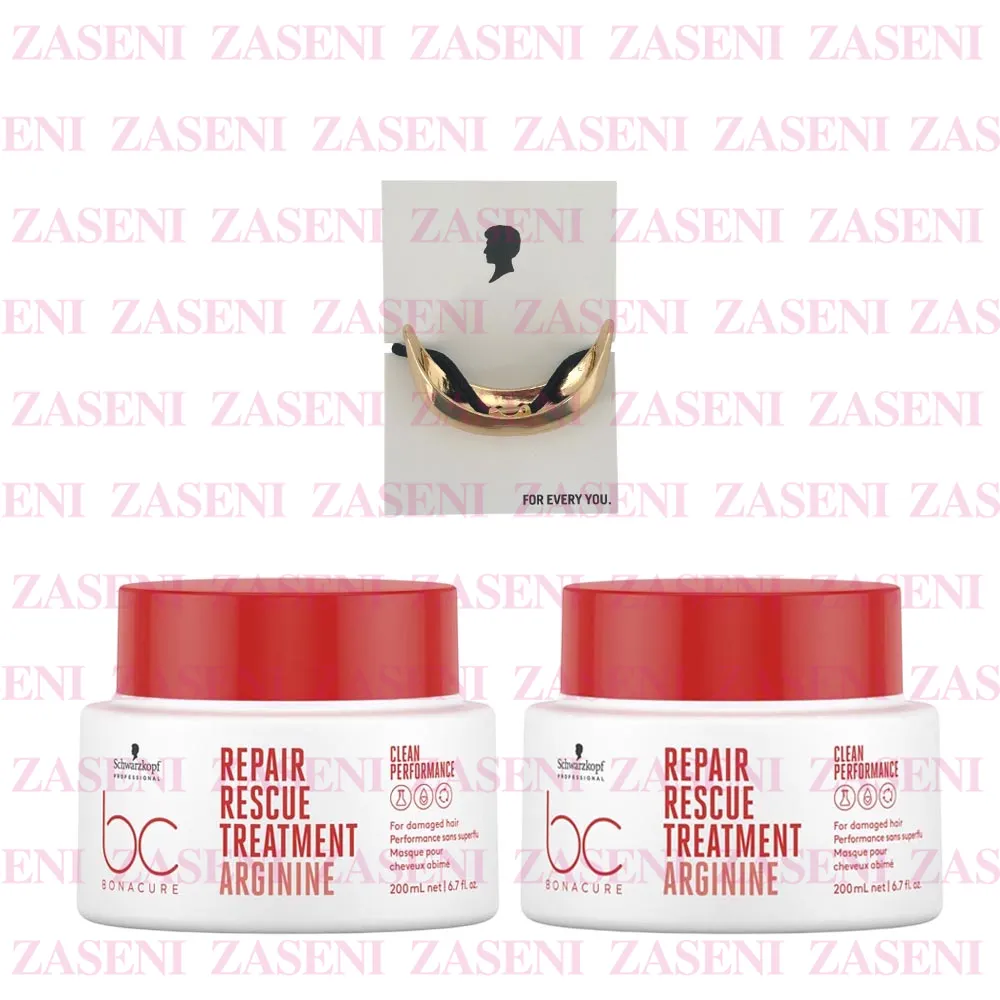 Pack compuesto por dos mascarillas reparadoras de la línea Repair Rescue de Schwarzkopf, la cual repara profundamente el cabello dañado, junto con un bonito coletero dorado de regalo de la propia marca.