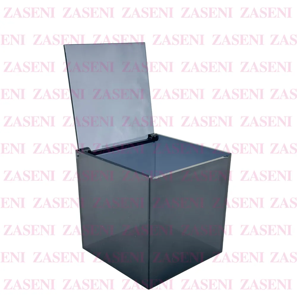 Caja de metacrilato con tapa abatible diseñada para almacenar de manera práctica y moderna todo tipo de accesorios de estética.