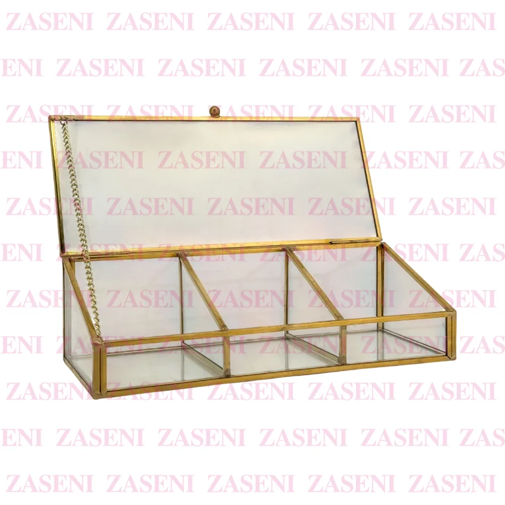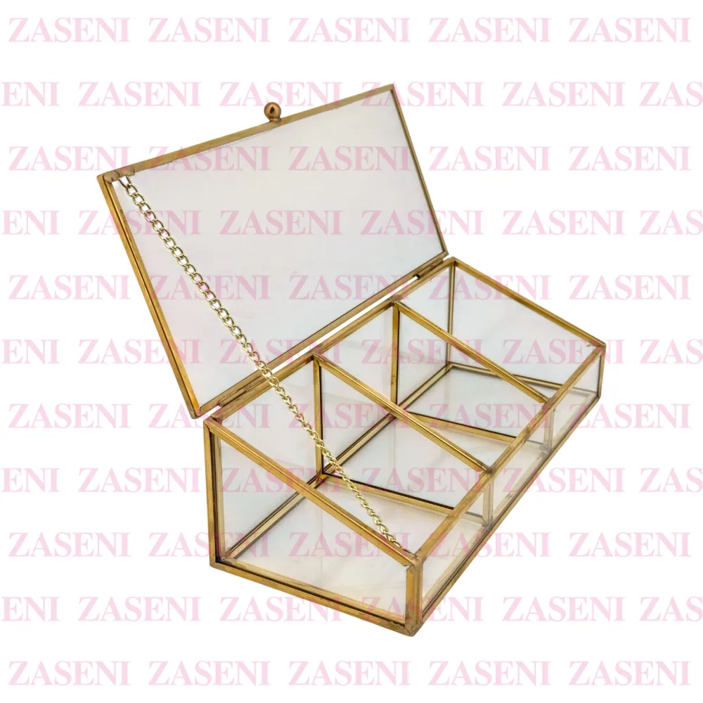 Organizador de cristal con bordes dorados elegante y funcional diseñado para organizar maquillaje u otros utensilios consiguiendo un espacio organizado y práctico.