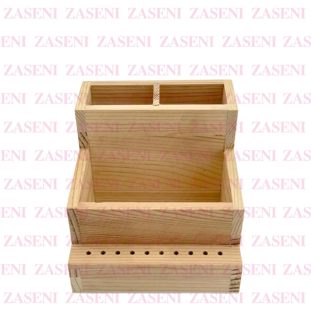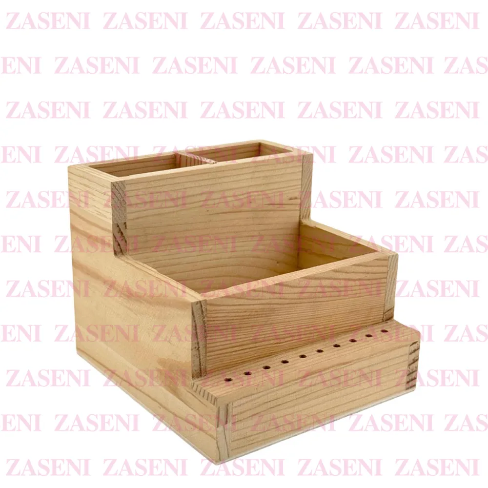Organizador de madera con varios compartimentos diseñado para organizar los utensilios de maquillaje de manera práctica consiguiendo un espacio organizado y protegido.