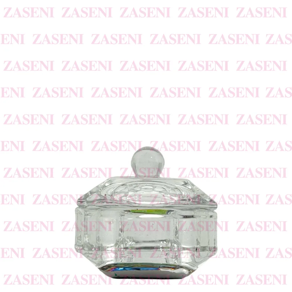 Vaso de cristal grueso y resistente con tapa y base con efecto iridiscente diseñado para facilitar el uso del monómero durante la realización de uñas acrílicas, consiguiendo un trabajo práctico y funcional.