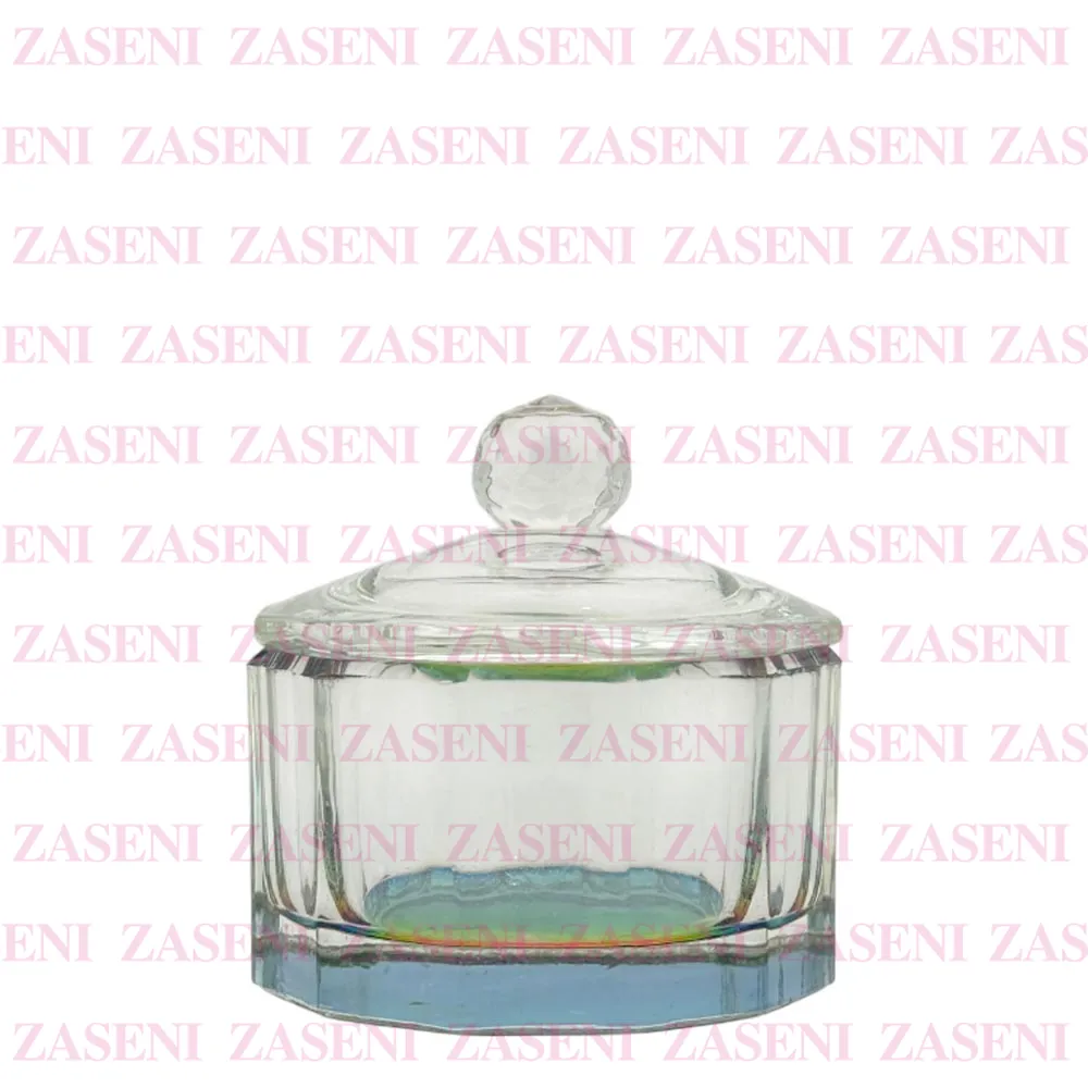 Vaso de cristal grueso y resistente con tapa y base con efecto iridiscente diseñado para facilitar el uso del monómero durante la realización de uñas acrílicas, consiguiendo un trabajo práctico y funcional.