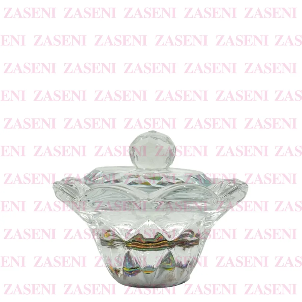 Vaso de cristal grueso y resistente con tapa y base con efecto iridiscente diseñado para facilitar el uso del monómero durante la realización de uñas acrílicas, consiguiendo un trabajo práctico y funcional.