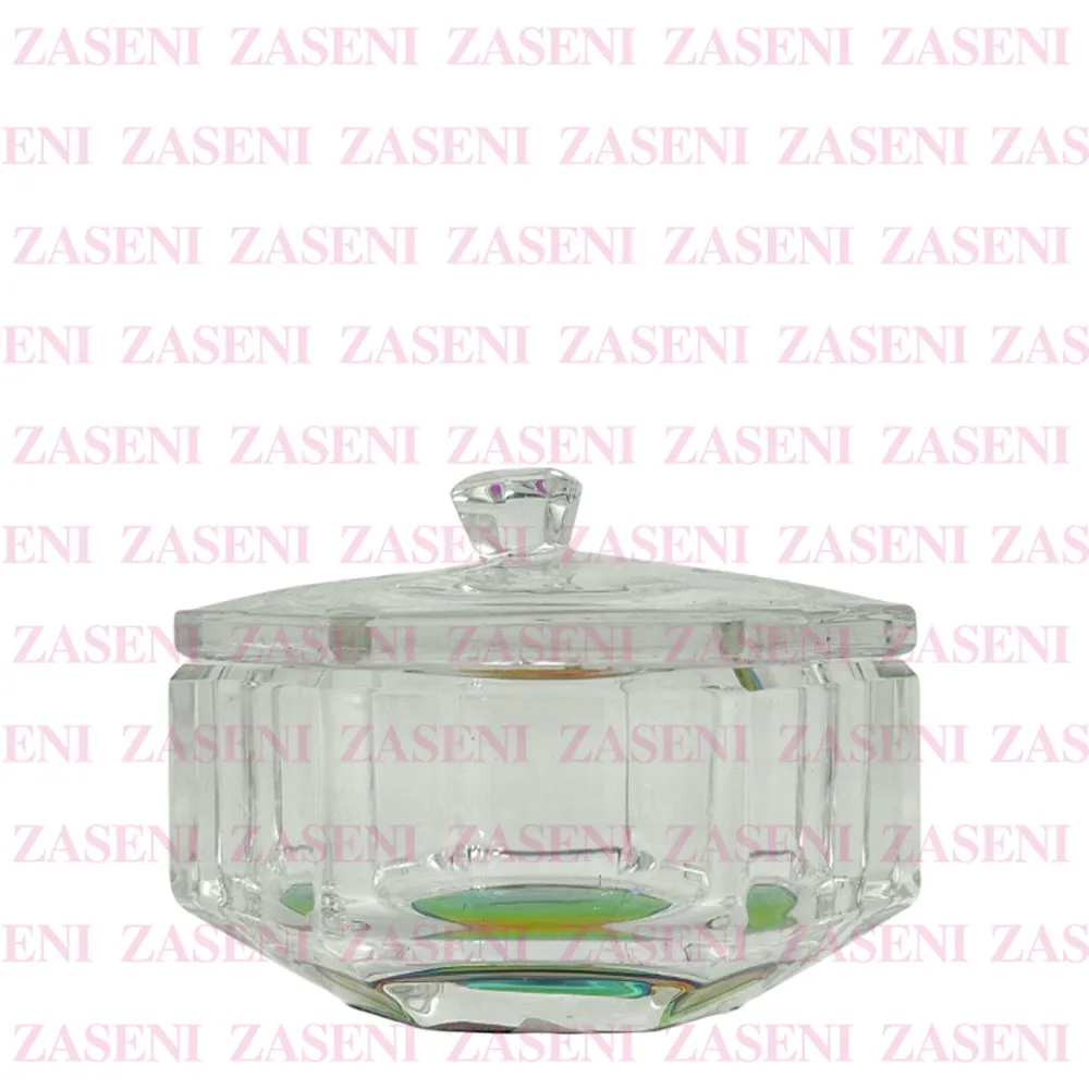Vaso de cristal grueso y resistente con tapa y base con efecto iridiscente diseñado para facilitar el uso del monómero durante la realización de uñas acrílicas, consiguiendo un trabajo práctico y funcional.