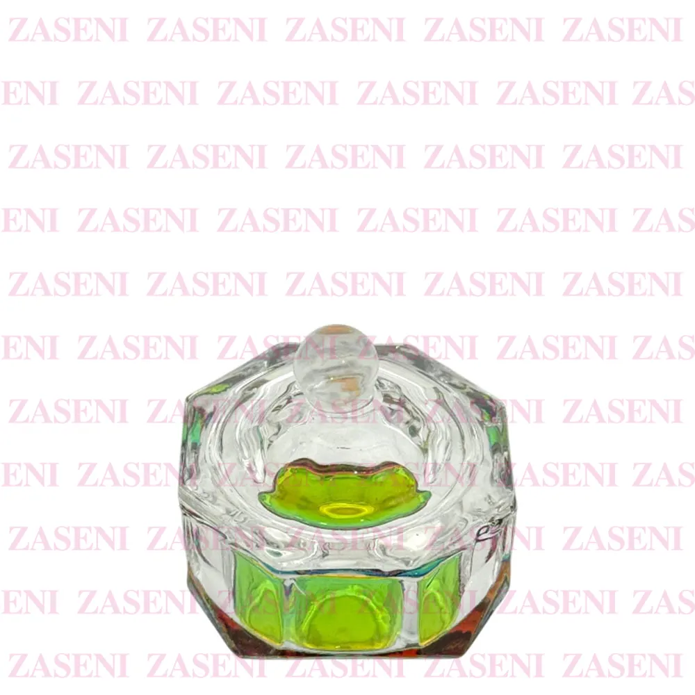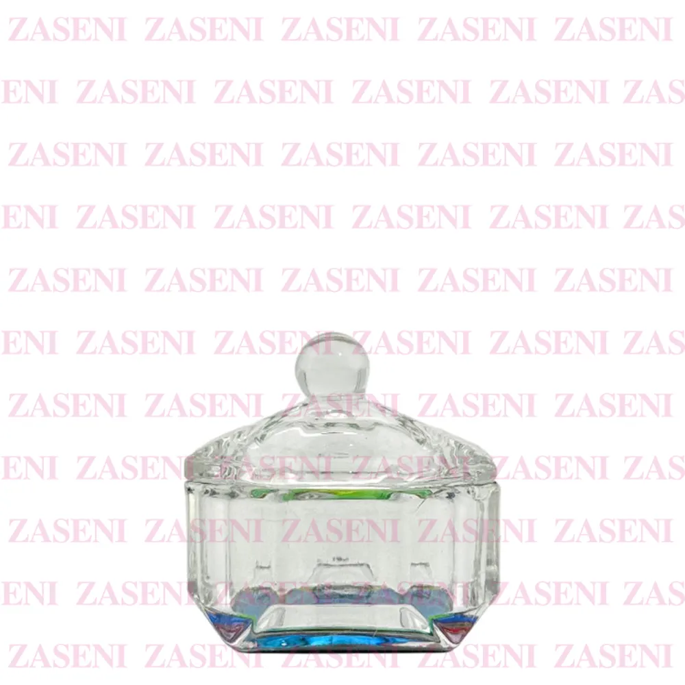 Vaso de cristal grueso y resistente con tapa y base con efecto iridiscente diseñado para facilitar el uso del monómero durante la realización de uñas acrílicas, consiguiendo un trabajo práctico y funcional.