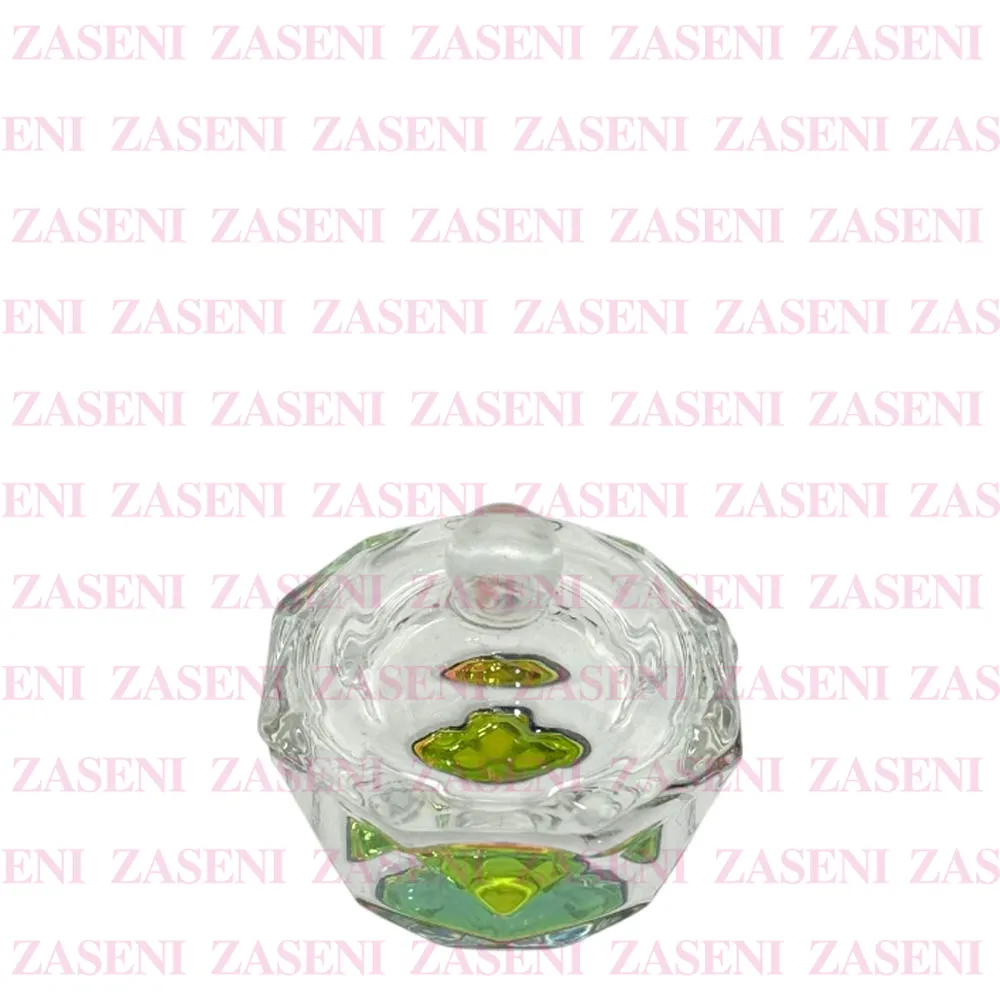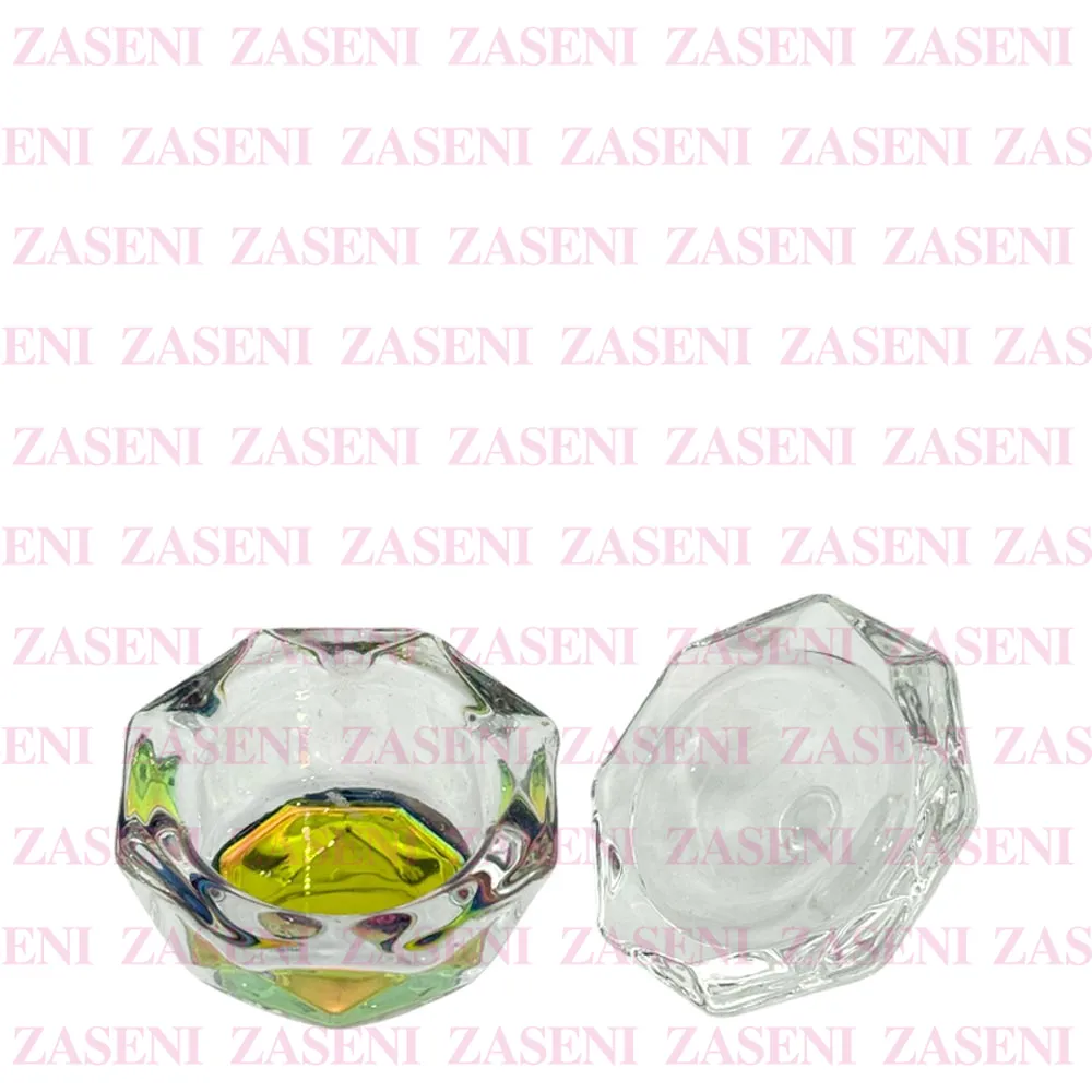 Vaso de cristal grueso y resistente con tapa y base con efecto iridiscente diseñado para facilitar el uso del monómero durante la realización de uñas acrílicas, consiguiendo un trabajo práctico y funcional.