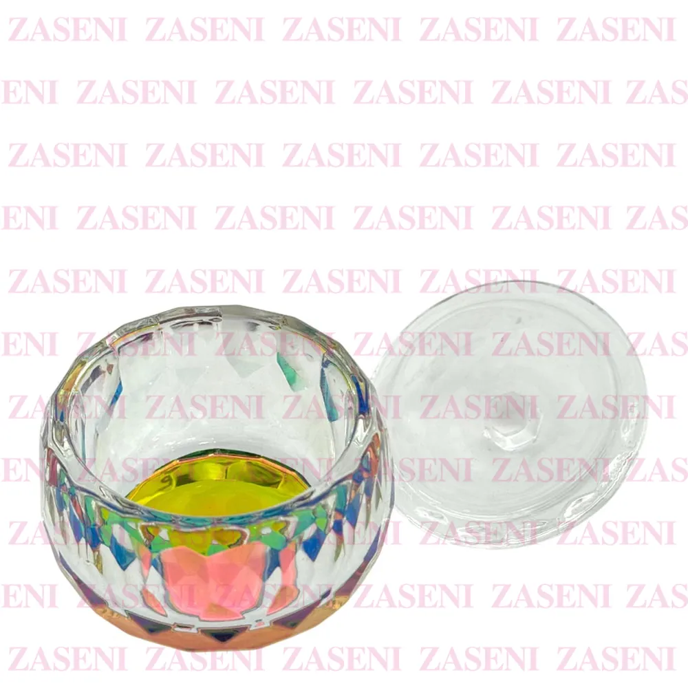 Vaso de cristal grueso y resistente con tapa y base con efecto iridiscente diseñado para facilitar el uso del monómero durante la realización de uñas acrílicas, consiguiendo un trabajo práctico y funcional.