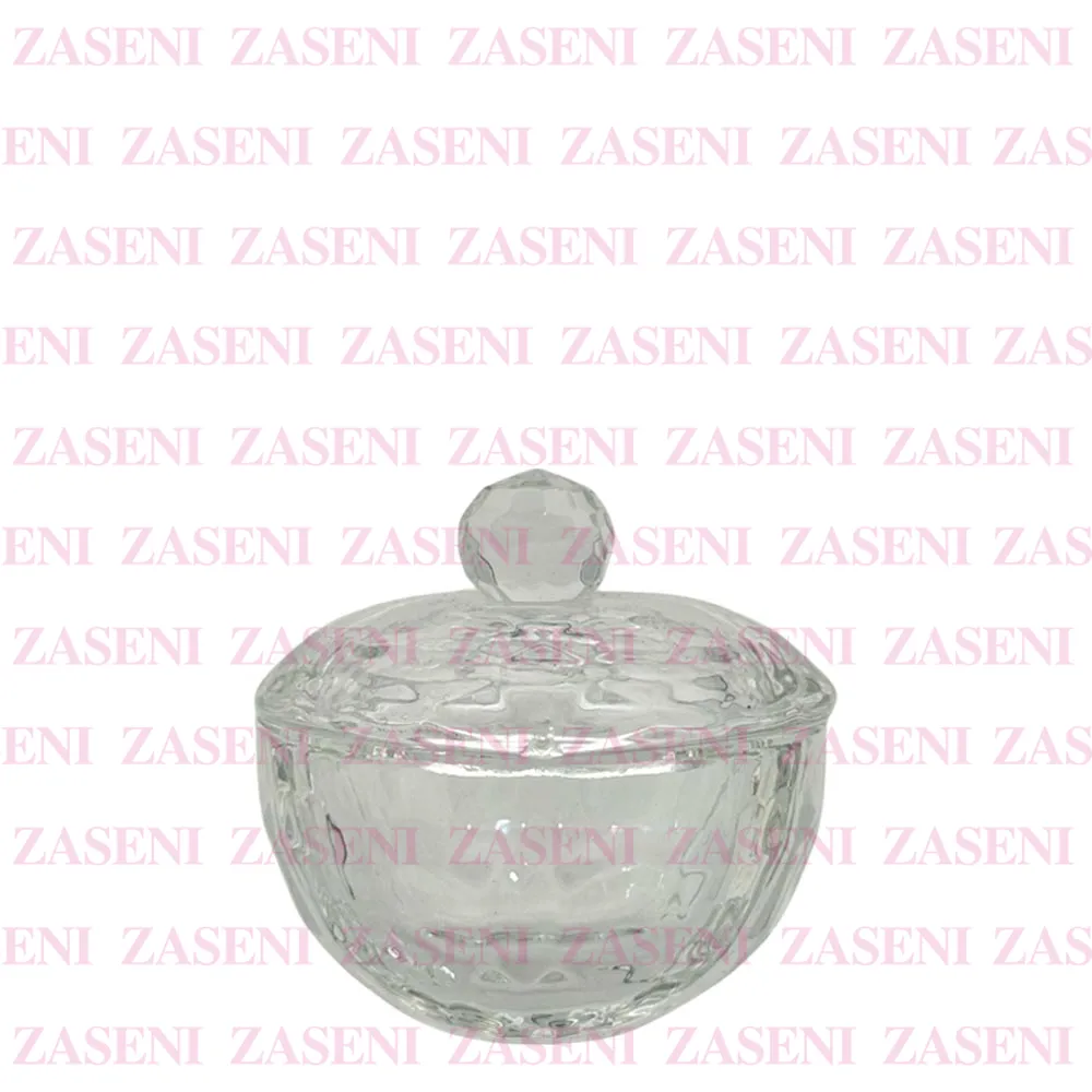 Vaso de cristal transparente con tapa grueso y resistente diseñado para facilitar el uso del monómero durante la realización de uñas acrílicas, consiguiendo un trabajo práctico y funcional.