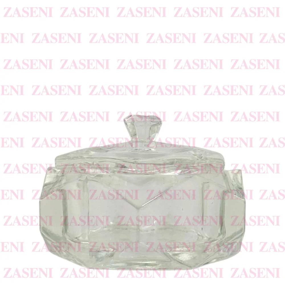 Vaso de cristal transparente con tapa grueso y resistente diseñado para facilitar el uso del monómero durante la realización de uñas acrílicas, consiguiendo un trabajo práctico y funcional.